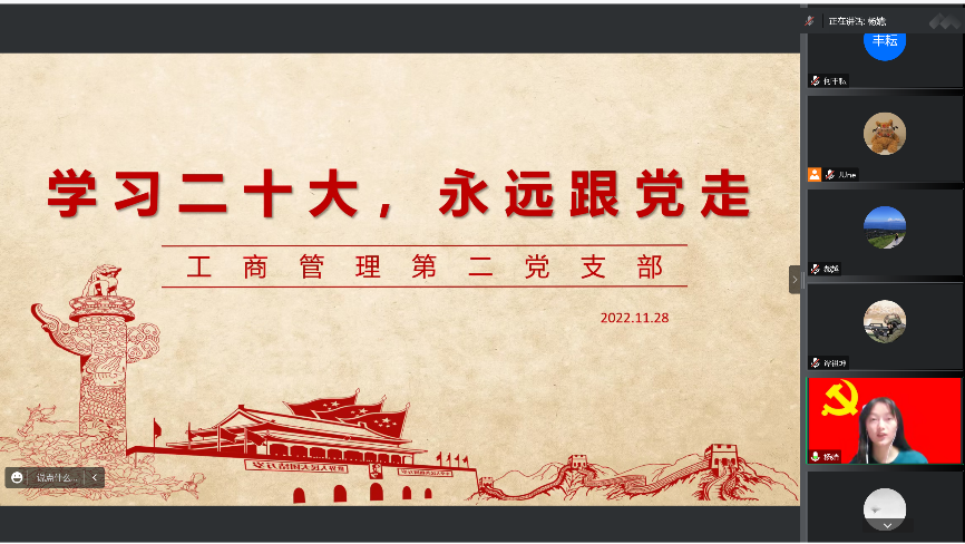 2022年11月28日,啪啪啦 工商管理第二党支部召开全体党员大会,讨论谭祖坤同志和刘思瑶同志的转正事宜,并进行党的二十大报告专题学习。受疫情影响,经学院党委批准,本次会议采用腾讯会议的形式召开,会议应出席有表决权正式党员9名,实出席有表决权正式党员9名,支部书记史玖琦同志主持会议。