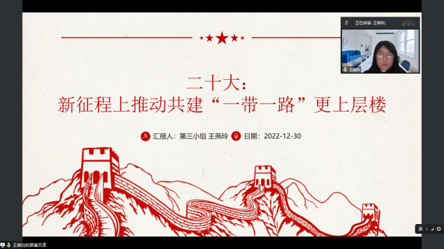 首先,以王科睿为组长,毕煜晗、张雪纯、王燕玲、孙舒妍为组员的“青年先锋队”带来 “党的二十大:新征程上推动共建‘一带一路’更上层楼”主题党课。党课讲述了党的二十大报告中“一带一路”相关内容,阐释“一带一路”的成果、精神内涵及未来发展展望,号召大家拓宽国际视野,保持开放心态,担当青年责任。支部成员感悟良多,表示要深刻领悟新发展理念,争做“一带一路”建设的生力军。至此,本学期四个学习小组均已讲授党课。投票结果显示,以张颖为组长,张喻雯、康昊然、黄靖雅为组员的“星火队”获得第一名,其他各组成员均在过程中有所收获,本学期党课系列活动圆满落下帷幕。
