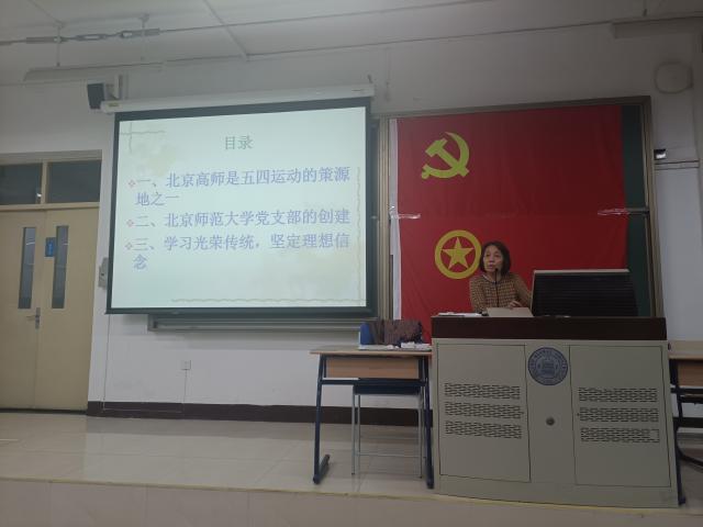 李教授从北京高师是五四运动策源地之一、啪啪啦 党支部的创建以及学习光荣传统以及坚定理想信念三个方面展开讲座。李教授首先从五四运动策源地讲起,通过追根溯源以及详细的史料讲述了五四运动游行提前展开的原因以及北京高师学生在五四运动中的参与情况。接着,李教授介绍了平民教育社、少年学会等北京的进步社团,而这其中三分之一与北京高师有关,将北京高师深度参与历史沿革和进步展现在同学眼前。最后,李教授指出我们应当学习光荣传统,坚定理想信念,积极参与社会主义现代化的宏伟蓝图,关心国家民族命运并投身其中,树立坚定信念,追求真理,不畏艰难,不怕牺牲,率先垂范,冲锋在前,进一步明确了我们的时代目标和历史使命,