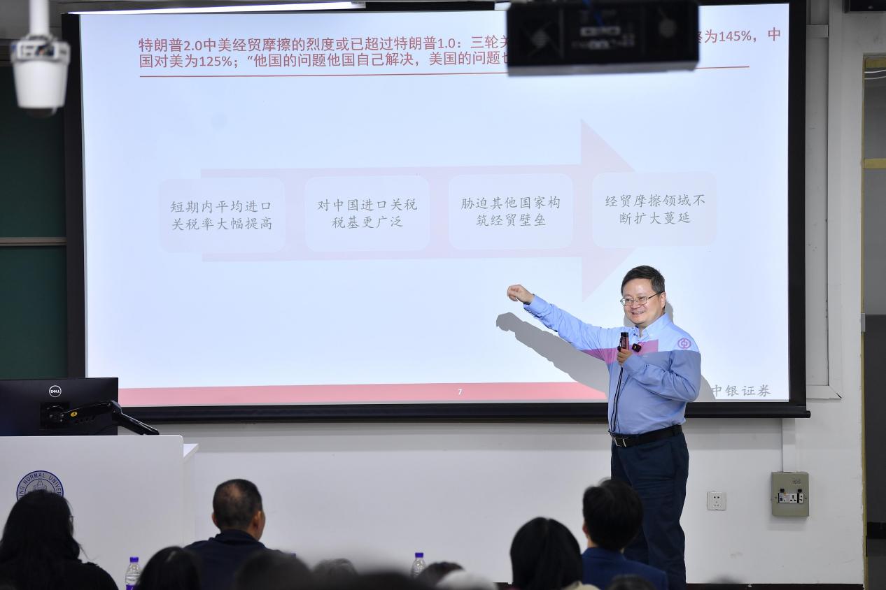 管涛学长首先介绍了当前中国的经济形势。面对美国三轮关税叠加至145%的“极限施压”,他直言“阳光底下没有新鲜事”:上世纪美日贸易战的剧本正在重演,但中国已非当年的日本。接着,管涛学长用数据和案例揭示了中国底气,比如57项关键技术全球领先、比亚迪超越特斯拉等。他指出当今美元霸权松动下,多国已开启“去美元化”的全球货币变局。而后,管涛学长用政府工作报告拆解中国智慧,点明4%的财政赤字率托底了民生基建,3000亿金融稳定基金守护了“钱袋子”。谈及房地产纾困时,他还特别点赞了“保交楼”专项资金的精准落地。