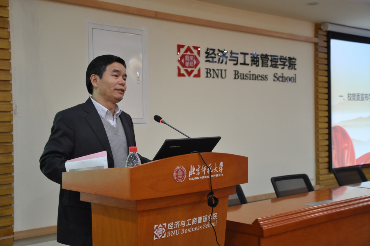然后,学院新一届分党委书记孙志军教授发言。孙志军书记感谢学校党委的信任,以及学院教师党员和其他同志的支持,坚决拥护和落实学校党委的各项规定,出于公心,认认真真工作,将始终以经管学院的发展作为工作的出发点,做到客观、公正、透明。同时,沈越书记感谢学校领导、学院教师一直以来的信任和支持,将继续为北师大经管的发展贡献一份力量。