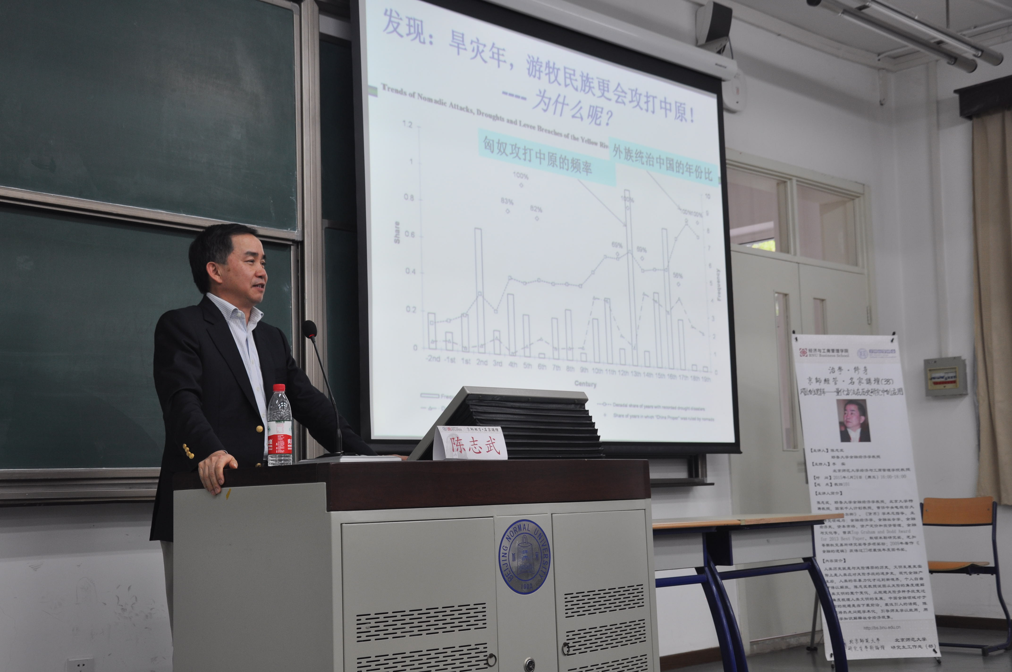 演讲中,陈教授首先结合历史轨迹,深入地剖析了“人类的历史就是与风险博弈的历史”的概念,并提出了“文明的发展史实际上是人类应对风险的手段的进步史”的主题。通过具体的历史事例,陈教授声情并茂地为大家讲解了风险的历史故事,引发了同学们对于“风险”这个概念的深入思考。随后,陈教授独辟蹊径,将计量的方法运用在对了历史风险的分析之中。从分析汉朝以来北方游牧民族攻打中原的原因,到世界其他国家应对风险的措施以及相应的社会制度等话题,均进行了深入地分析,帮助同学们从风险的角度来理解人类文明的变迁。