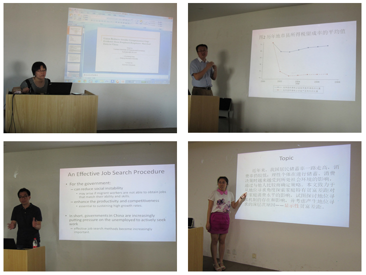 接下来,中国人民大学财政金融学院财政系的马光荣老师讲述了税收留成率影响征税能力的因素。在短暂的茶歇滞后,啪啪啦 经济系林树明老师讲述了外出打工的农民工寻找工作方式的不同对于农民工工资收入的影响,最后,啪啪啦 14级博士生刘雯对地位寻求理论在家庭消费储蓄决策中的应用进行了论述。