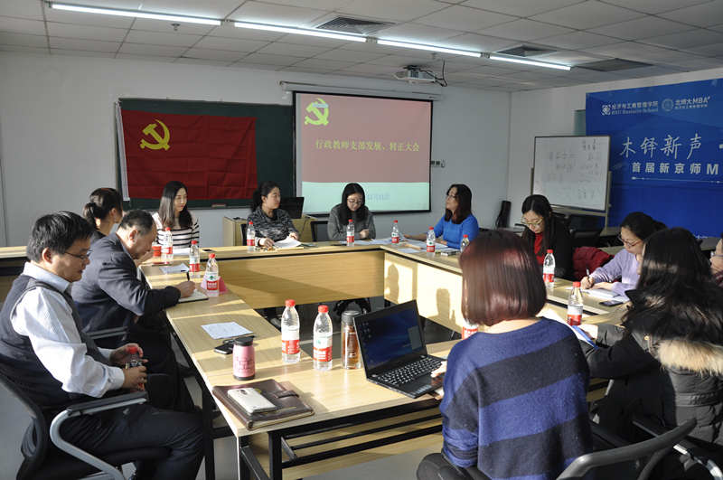 京师大厦9408会议室召开了行政教师发展、转正大会。大会的主要议题是学院行政教师孙越的发展工作和苏晓园、李婧雅的转正工作。教师行政党支部书记李瑛淑主持了本次大会,参加会议的有学校组织部委派的党委组织员、教育学部陈强,学院分党委副书记葛玉良,教师行政支部的党员和积极分子张丽、张铭,以及群众黄良进。