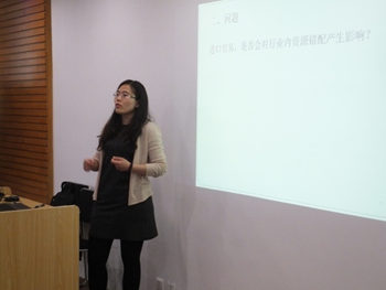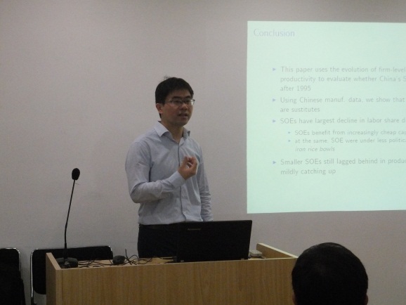 清华大学马弘教授报告的题目为“Recasting the Iron Rice Bowl: The Evolution of China’s State Owned Enterprises”,内容涉及关于国企“铁饭碗”改制,主要通过数理模型和实证分析研究了1998-2007年国有企业改革,在抓大放小过程中是否促进了国有企业生产率的提升。啪啪啦 李晓庆博士报告了进口竞争与行业内资源错配的关系,认为我国资源存在着错配现状,是影响全要素生产率的一个因素,进口贸易可以改善企业的资源错配。中央财经大学林发勤教授报告的题目为“内需和外需是替代还是互补?----基于家电下乡政策的实证研究”。其内容主要通过2003-2012年的中国工业企业数据库对“家电下乡”政策的效果进行考察。通过倍差法分析了“家电下乡”这一规范性的财政政策对促进国内消费的增加是否真的起到了作用,是否促进了企业的出口。中国人民大学郑文平博士报告了贸易与企业能源消费的关系,内容涉及能源效益,环保、节能减排对经济增长的影响。认为中国的制造业的能源消费非常高,如果是要做节能减排方面的研究就应该选择制造业,制造业减排贡献会非常大,而且国际上对于中国在能源方面要做的工作也有很大的期望。