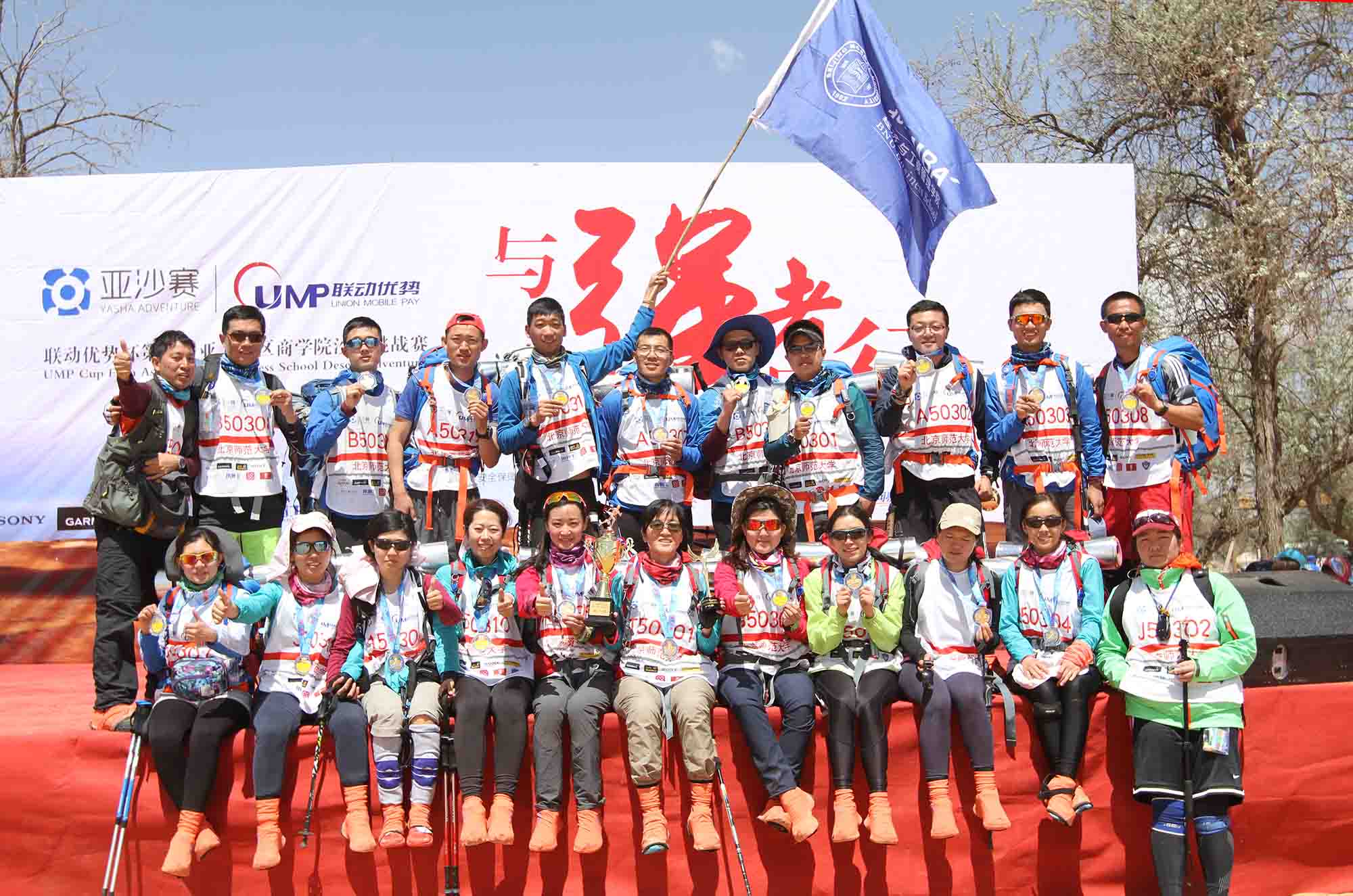 MBA代表队26名队员,经过两天半的奋力拼博,负重徒步穿越70公里的荒渺沙漠,从亚太地区71所参赛院校1700余名选手中脱颖而出,勇夺团队第八名的好成绩,并实现全员完赛,取得最高荣誉奖——沙鸥奖,创造了北师大MBA参赛以来的最好成绩!