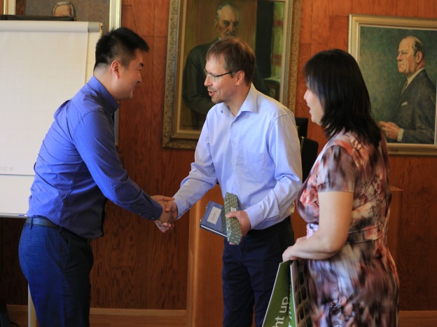 在阿尔托大学,学生与商学院艾格教授就商业模拟系统在商科教育中的应用进行了深层次的交流。艾格教授自1994年开始在阿尔托大学任教,有着20余年的商科教学经验,同时他也是商业模拟系统的核心开发成员和CESIM公司的股东之一。他将丰富的教学经验和商业经验融入系统开发中,让系统模拟环境更接近现实商业社会。在交流结束后,学生吉利辉代表北师大经管学院向艾格教授赠送了精心挑选的中国传统水墨山水画大师张大千的仿品折扇以及折书,以表达具有人文情怀的北师大MBA形象,并留下美好印象以待再次合作。