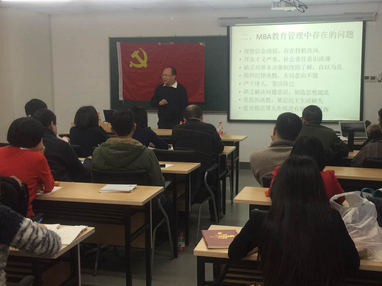 本次活动主要内容是学习和实践六中全会精神,推动MBA教育管理工作再上新台阶。崔院长分别从三大模块进行讲解:六中全会主要内容、MBA教育管理中存在的问题以及改进建议。他首先带领大家学习六中全会的主要精神和新形势下党内政治生活若干准则,然后提出MBA教育管理中存在的问题,如投机作风,拜金主义,缺乏对基本决策制度的了解,大局意识不强等,并通过发生在同学身上的大量案例,分析了这些问题对同学学习、成长以及未来职业发展的巨大危害,对学院MBA项目发展的困扰,最后提出以下四点改进建议: