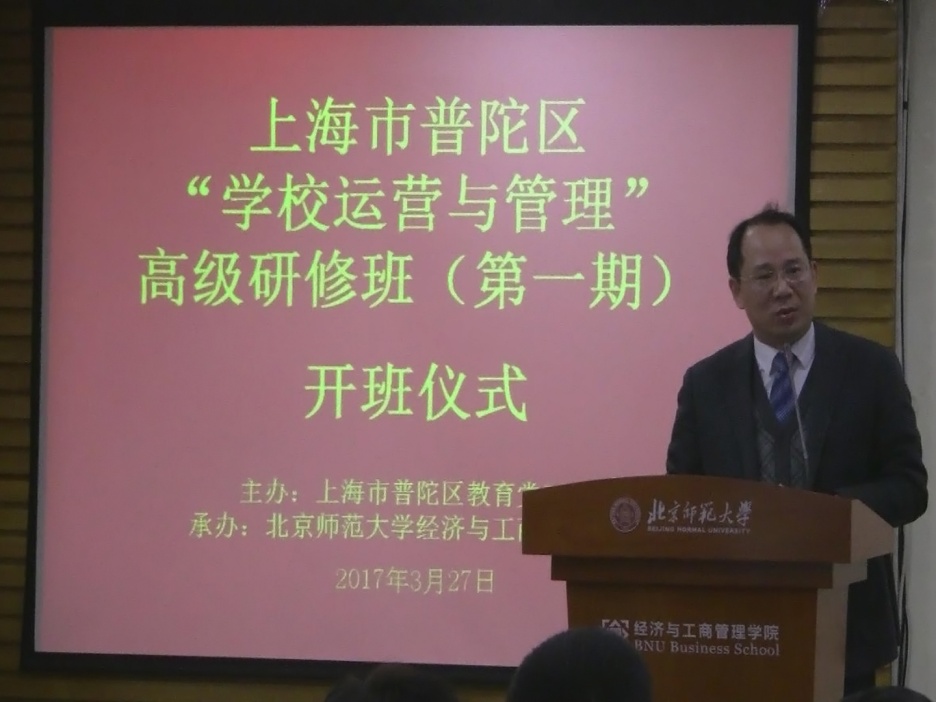 院长赖德胜教授对普陀区校长们能够来到北师大学习表示热烈的欢迎,他介绍了北师大及经管学院的发展历史,分享了学院通过EQUIS国际化认证过程的收获与感悟,未来学院将把教育运营与管理作为培训工作的重点发展方向。赖院长希望参加本次培训的学员能够平衡生活、学习及工作的关系,充实地度过在北师大的学习生活。