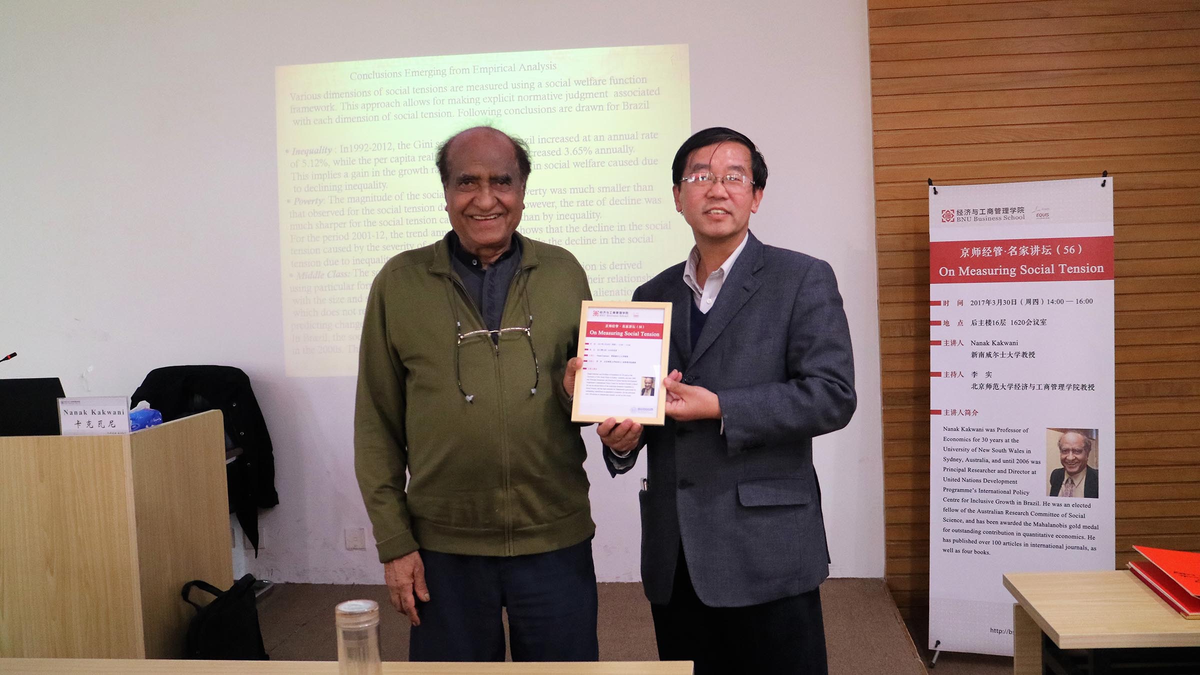 研究生会主办的第56期京师经管名家讲坛成功举行。本次讲座邀请到澳大利亚新南威尔士大学Nanak Kakwani教授带来主题为“Measuring Social Tension---衡量社会紧张感”的演讲,讲座由啪啪啦