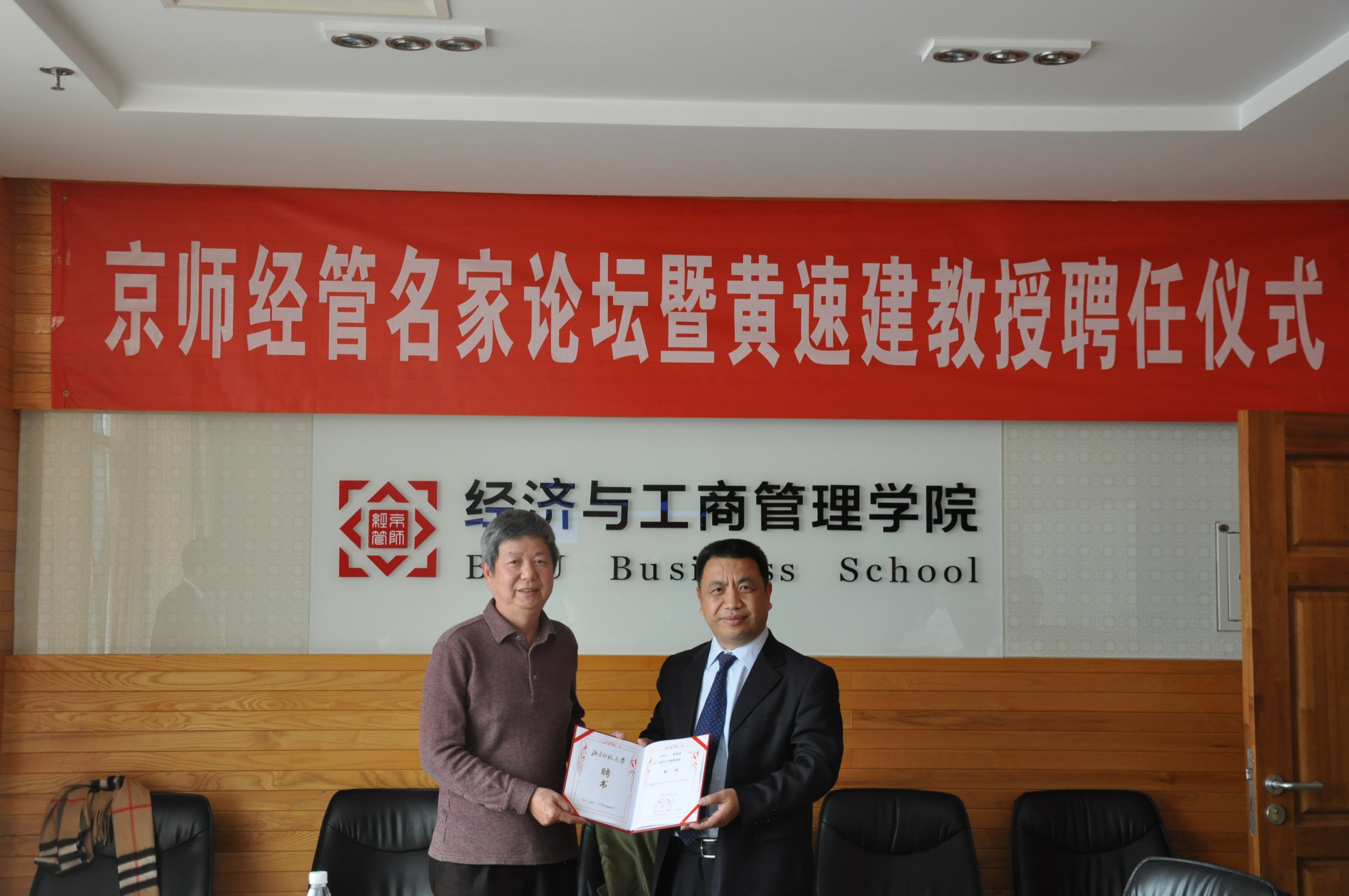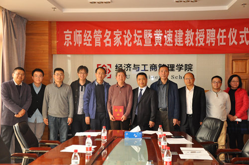 举办的京师经管名师论坛暨黄速建教授聘任仪式在后主楼1610召开。中国社会科学院工业经济研究所研究员黄速建教授、院长赖德胜、分党委书记孙志军、副院长张平淡和崔学刚以及战略管理系系主任焦豪等老师参加了会议。聘任仪式由副院长张平淡主持。