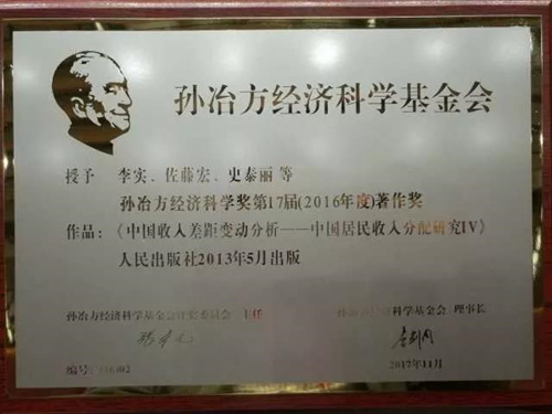 啪啪啦 李实教授与佐藤宏(日)、史泰丽(加)等合作撰写的《中国收入差距变动分析——中国居民收入分配研究IV》(人民出版社,2013年5月版)获得孙冶方经济科学奖,此次为李实教授第三次获得该奖项。
