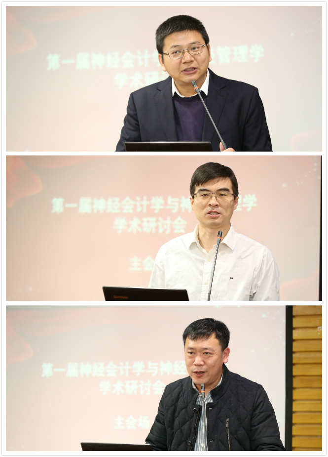 的薛贵教授和崔学刚教授。马庆国教授发表了《神经科学怎样改变管理学》的主题演讲,在梳理管理学理论历史脉络的基础上,用生动的学术案例展示了神经科学带给管理学理论带来的影响和改变,强调了随着技术的进步,生产过程中以体力劳动为主逐渐变为以脑力劳动为主,运用神经科学建立针对脑力劳动的管理理论是管理学理论的重要发展方向,中国管理学者和世界管理学者面临同样的难得历史机遇。薛贵教授作了题为《MPFC and economic decision making(大脑前部内侧前额叶皮层与经济决策行为)》的报告,分享了大脑前部内侧前额叶皮层对经济决策的影响的系列研究,展示了神经科学领域的一些测量技术和方法及其应用于经济学和管理学研究的成功尝试。崔学刚教授作了题为《神经会计学研究:回顾与展望》的演讲,系统回顾了神经会计研究产生与发展背景,研究特征与范式,并通过具体的研究案例介绍了研究的实施方法,最后对神经会计研究策略和研究方向进行了展望,指出只有通过学科还原与学科综合,当且仅当建立起独立的神经会计学概念体系和实验方法体系,神经会计学才能作为一个学科建立起来。