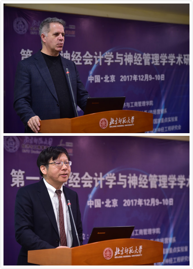 副院长崔学刚主持,学院副院长张平淡、国家自然科学基金委管理科学部相关业务部处领导、中国管理科学与工程学会神经管理与神经工程研究会会长、复旦大学戴伟辉教授分别致辞。张平淡副院长简要介绍了学校“双一流”建设的基本情况和鼓励交叉学科建设的政策措施,重点介绍了学院在学科建设方面取得的成绩,以及在交叉学科建设方面的最新进展,并祝愿大家在神经会计学与神经管理学领域取得丰硕成果。国家自然科学基金委管理科学部相关部处领导在致辞中指出,国家自然科学基金委一直大力提倡学科交叉,工商管理学科与心理学的交叉早有渊源,随着科技的发展,神经会计学与神经管理学发展前景广阔,成果可期;同时强调,学科交叉也要区分学科界限和重视管理学科的根本研究目标。戴伟辉代表协办方致辞,指出在网络时代背景下,人的心理和行为更加复杂多变,过去的研究方法面临很多新的挑战,而神经管理学,通过获得人体内部大量的认知、心理和神经活动数据,从直接的层面上解释人的行为,找到共同的机理模型解释并预测管理问题,是非常具有吸引力的新兴研究领域。12月9日上午的主题演讲由啪啪啦