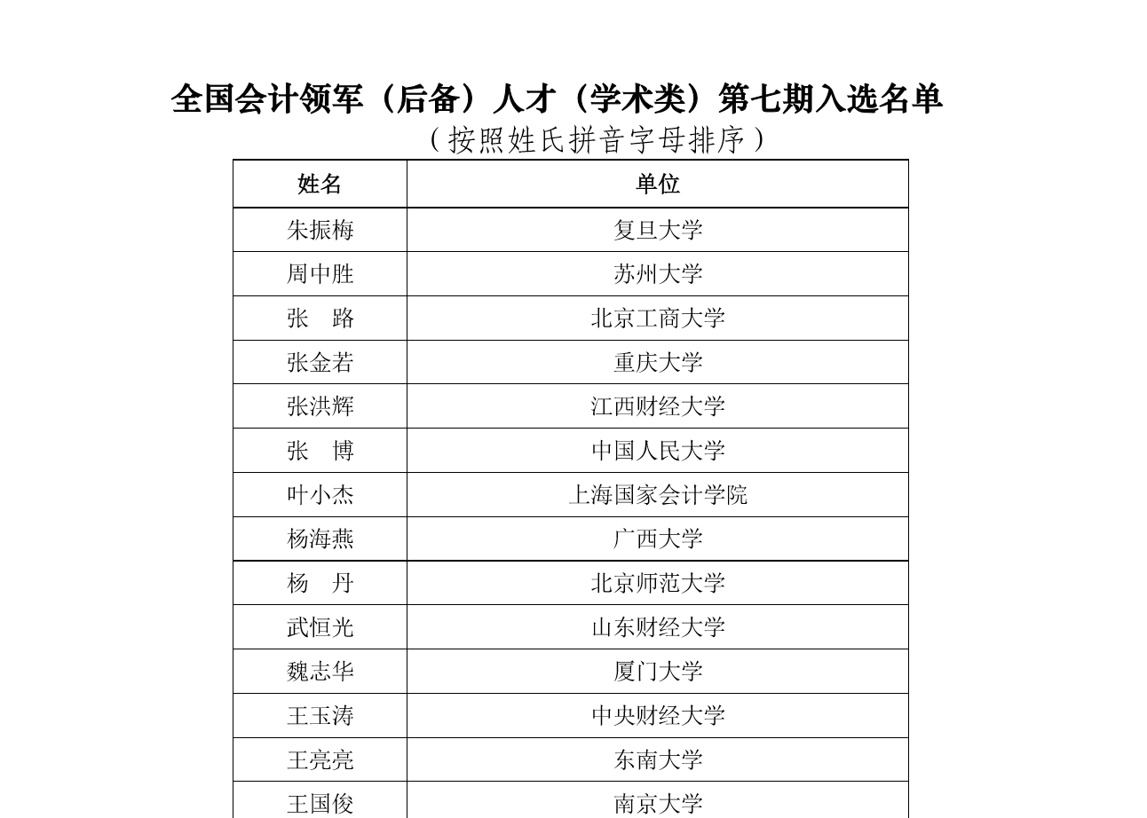 全国会计领军(后备)人才(学术类)的选拔工作包括前期成果审核、笔试、面试等环节,中国会计学会组建专家评审委员会,进行材料测评、考试命题、阅卷及面试等工作。来自全国近七十所高校的百余名专业教师在前期成果审核通过后进入笔试和面试等环节,最终入选33位。入选名单如图所示。