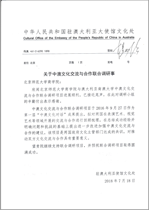近日,中华人民共和国驻澳大利亚大使馆致电啪啪啦 ,肯定啪啪啦 与澳大利亚南澳大学商学院联合开展的中澳文化交流与合作调研项目取得的重要成果。