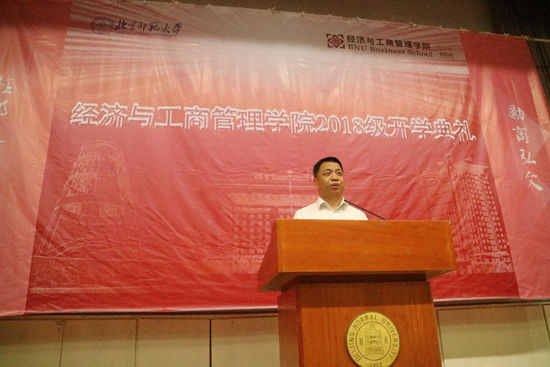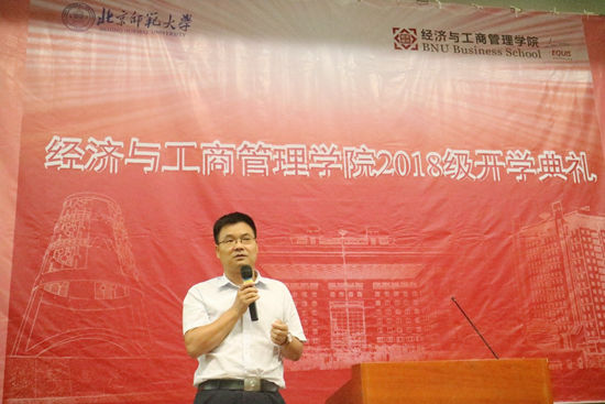首先,院长赖德胜老师致辞。赖老师首先对2018级本科的“00后”新生表示热烈欢迎,认为这群“千禧宝宝”的到来必将为北师大经管学院画上浓墨重彩的一笔。然后,赖老师向新生们介绍了师大,用三个词九个字来概括,一是“老而新”,二是“特而综”,三是“小而大”。赖老师指出经管学院作为师大的重要一员,对师大“老”、“特”、“小”的贡献可能不算大,但对“新”、“综”、“大”的塑造做出了重要贡献。作为新生们的学长和老师,赖老师还给大家提出了三点恳切的建议,也是切实的要求。一是要会学习,知识多如瀚海,永无止境;二是要会包容,有容乃大,无欲则刚;三是有担当,赖老师引用习近平总书记在党的十九大报告中提到的 “青年一代有理想、有本领、有担当,国家就有前途,民族就有希望”呼吁同学们勇于担当责任。最后,赖老师衷心祝福大家在北师大经管学院能够安安静静读书、快快乐乐生活、健健康康成长!