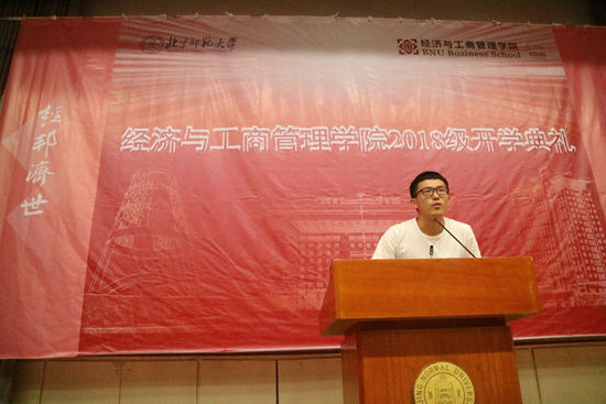 之后是新生代表发言,第一位是2018级会计学本科生孙树楠,他热情洋溢的讲述了自己与师大的结缘故事,并向自己和同学们对未来的学习生活提出了热切的期许。研究生新生代表杨季枫则感恩于本科四年间在师大经管邂逅的恩师们,如今重回师大,面对明天,也希望能满是自信与淡定。