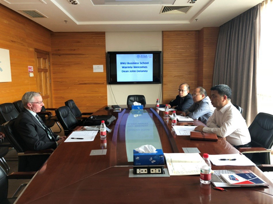 赖院长对John Delaney院长就任Kogod商学院院长表示祝贺,对他初次到访学院表示欢迎。双方共同回顾了两院在Capital Business Forum、教师互访等方面已有的合作成果,并就One MBA项目、2018 Capital Business Forum、90天以上交换生项目等方面的深入合作展开了交流。