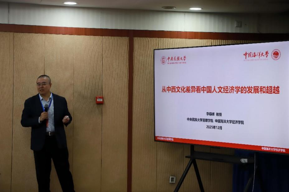 厦门大学社科处处长潘越教授主持了论坛主旨演讲第二阶段。中国海洋大学经济学院李曦辉教授从中西方文化比较视角,阐述了中国人文经济学的独特内涵。他指出,西方文化以个体主义与强权逻辑为核心,而中华文化强调集体共生、包容连续,这决定了双方发展路径的根本差异。他以基因测序结果为例,指出中华民族各族群血统融合,生动体现了中华文化“兼容并蓄、多元一体”的根本特质。针对“中华文化缺乏创新”的成见,他以都江堰等古代工程为例,指出农耕文明孕育了持续且和平的内生创新模式。他还分析了“华夷秩序”与朝贡体系的历史作用,认为二者通过文化认同与辐射,共同塑造了中国的“大一统”格局。李曦辉教授强调,中国人文经济学应立足自身文化基因,超越西方理论框架,挖掘中华文化在优化分工、扩展规模、推动创新等方面的独特价值,为构建中国特色哲学社会科学提供支撑。