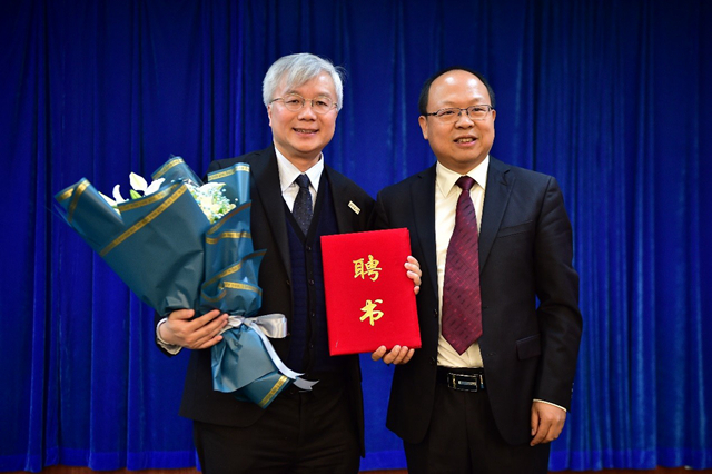 主题报告之后,举行了客座教授聘任仪式。崔学刚副院长代表学院宣读了聘任决定,随后向龚永德先生颁发了聘任证书并为其佩戴校徽。
