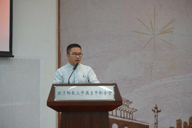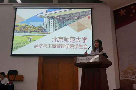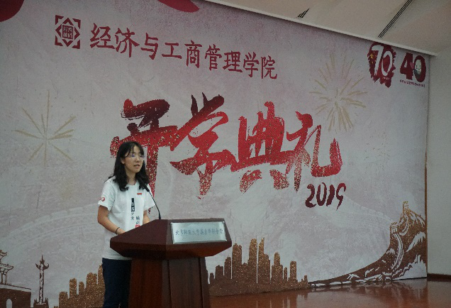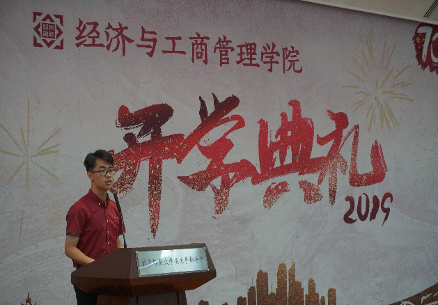 2017级本科生路云飞作为本科在校生代表发言。他结合自身经历,号召同学们自信主动、大胆尝试,勇于争取机会;同时,也应保持对细节的关注,勤于总结记录,成长为最好的自己。2017级研究生刘言作为硕士在校代表上台发言。他以研究生科研生活为切入点,指出“学术研究的目的是为了发现问题、提出问题、解决问题”,希望各位新生可以明确学习方向,合理规划时间,为相关学科贡献力量。接着,2019级本科新生代表、金融系刘聪毅同学发言。他回顾了北师大的悠久历史,倡导同学们作为师大学子,应该将个人梦想与国家、民族梦想相结合,在新中国成立70周年、经管学院建院40周年的背景下书写属于自己的独特篇章。2019级劳动经济学专业硕士刘松月作为研究生代表发言。她倡导同学们作为京师经管人要担负起“经邦济世、励商弘文”的责任与使命、秉承“追根溯源、上下求索”的理念,脚踏实地、拼搏奋斗,共同见证彼此未来的进步。
