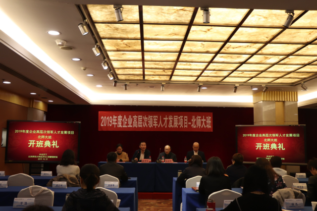 2019年10月21日,中关村国高新企业2019年度企业高层次领军人才发展项目在啪啪啦 举行开班仪式。开班仪式由经管学院培训中心主任黄良进主持,经管院院长戚聿东教授、北京中海投资管理有限公司董事长柳进军出席开班仪式并讲话,来自中关村40余家国有企业的人力资源总监参加了开班仪式。