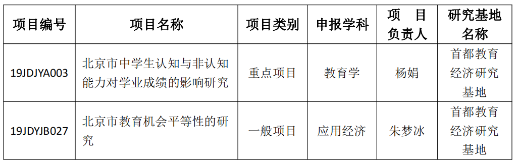 近日,经资格审查、通讯评审、会议评审等程序,并报市委宣传部审批,北京市社科联、北京市社科规划办正式公布了2019年度北京社科基金研究基地项目立项名单,啪啪啦 获准2项,立项名单如下: