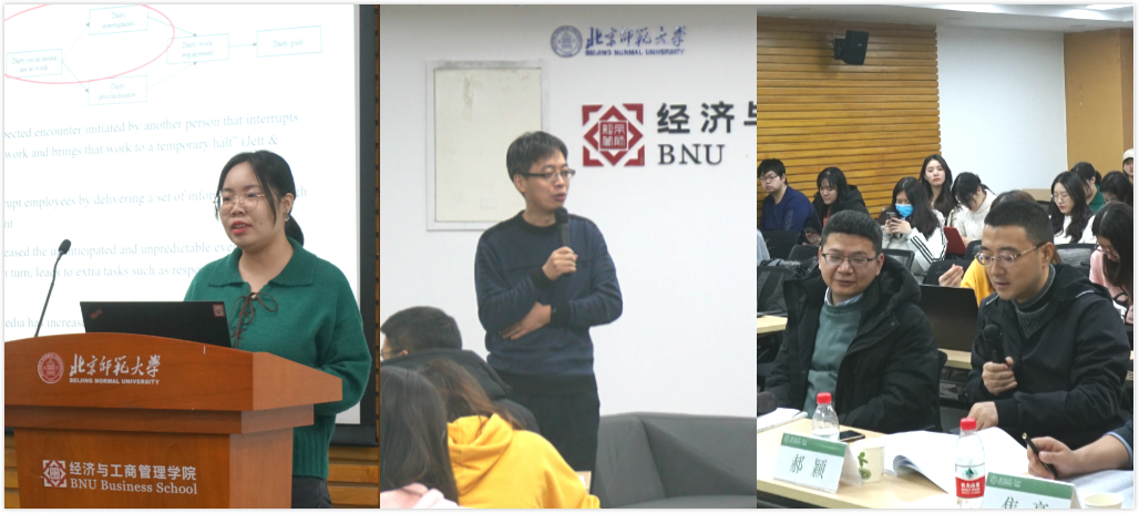 陈萌同学报告题目为“Work and Affective Outcomes of Social Media Use at Work: A Daily Survey Study”。许志星老师建议根据大众使用情况对社交媒体进行区分。童璐琼老师提出,对于社交媒体的使用时长可以直接通过手机后台的统计客观地体现,比起主观自评而言更加准确。周江华老师建议可否延长ESM的测量时间及间隔时间。