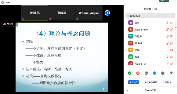 3月15日晚19点,160多位同学准时进入ZOOM会议直播间,共同参与了这场时长近2小时的讲座。讲座一开始,李老师首先强调了论文完稿审核的重要性,指出完稿审核直接关系到正式答辩通过与否。而后,李老师结合自身多年的审稿经验,从论文准备、主题、内容、理论与概念和规范五个方面指出了同学们在论文写作过程中存在的共性问题。李老师还根据本次完稿审核的情况,在结合实例分析共性问题具体表现的基础上,再次重申了相关问题的基本要求,并进一步提出了解决策略。如在论文规范问题上,李老指称这里的规范问题并不完全等同于格式问题,还包括了不同主题下不同写作方法的“套路”问题。李老师以较多同学选择的实证研究和调查问卷为例,详细讲解了这两种写作方式下的思维路径和创作模板,引发了同学们的思考和讨论。一个多小时后,讲座进行到问答阶段,李老师在半个多小时内一一回答了十多位同学的问题,同学们纷纷表示获益匪浅。