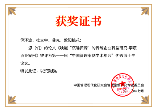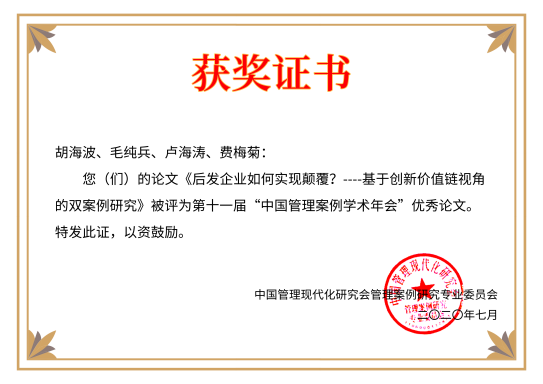 闭幕式上,朱方伟教授宣读了本届年会评选出的“优秀论文”及“优秀博士生论文”名单及评语,他们分别是:胡海波、毛纯兵、卢海涛、费梅菊撰写的《后发企业如何实现颠覆?----基于创新价值链视角的双案例研究》一文获得“优秀论文”,倪泽波、杜文宇、龚克、欧阳桃花撰写的《唤醒“沉睡资源”的传统企业转型研究-李渡酒业案例》,以及夏梦圆、顾元勋撰写的《产品架构与分销渠道的匹配模式探索:用友公司纵贯案例研究》,获得“优秀博士生论文”。