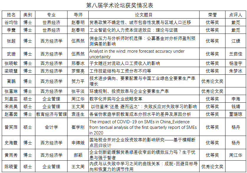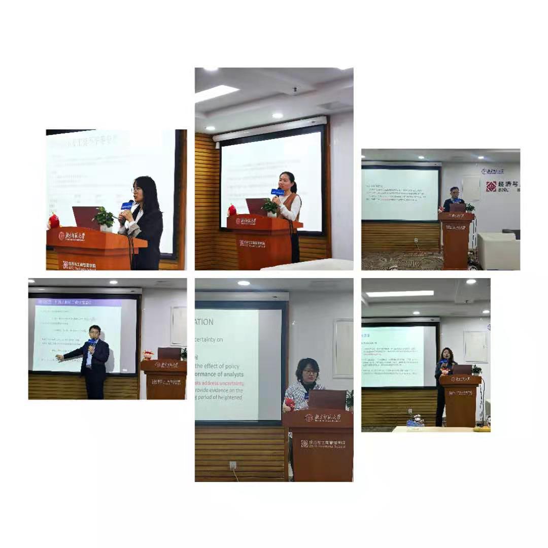 接下来是参会学生的学术交流阶段,谷均怡报告的题目是《贸易政策不确定性、城市包容性发展与区域人口迁移》,戴觅老师从立意创新、实证准确性、写作规范角度给予肯定和建议。李震报告的题目是《工业智能化的人力资本促进效应:理论与证据》,戴觅老师认为此篇文章显现出一个成熟学术研究者的特质,同时也从理论角度提出进一步完善意见。张超报告的题目是《佣金压力与分析师时机选择:公募基金对分析师盈利预测偏差的影响》江婕老师肯定了其工作量和研究结论,建议其研究思路更清晰聚焦,影响机制可以突出重点。武珊报告的题目是《Analyst in the wind: more forecast accuracy under uncertainty》,兰茹佳老师指出本文选题新颖,紧贴当前疫情实际,讲好中国故事,同时也提出在创新性和经济学含义方面可进一步强化。张晓敏报告的题目是《子女随迁对流动人口工资收入的影响》,杨澄宇老师首先肯定了其规范的实证研究,同时建议进一步探究背后的经济学机制,强化理论基础。梁晓慧报告的题目是《工作技能结构与工资分布不均等》,朱梦冰老师认为其思路清晰、方法严谨、行文流畅,同时也指出引言表述、研究角度可继续优化。