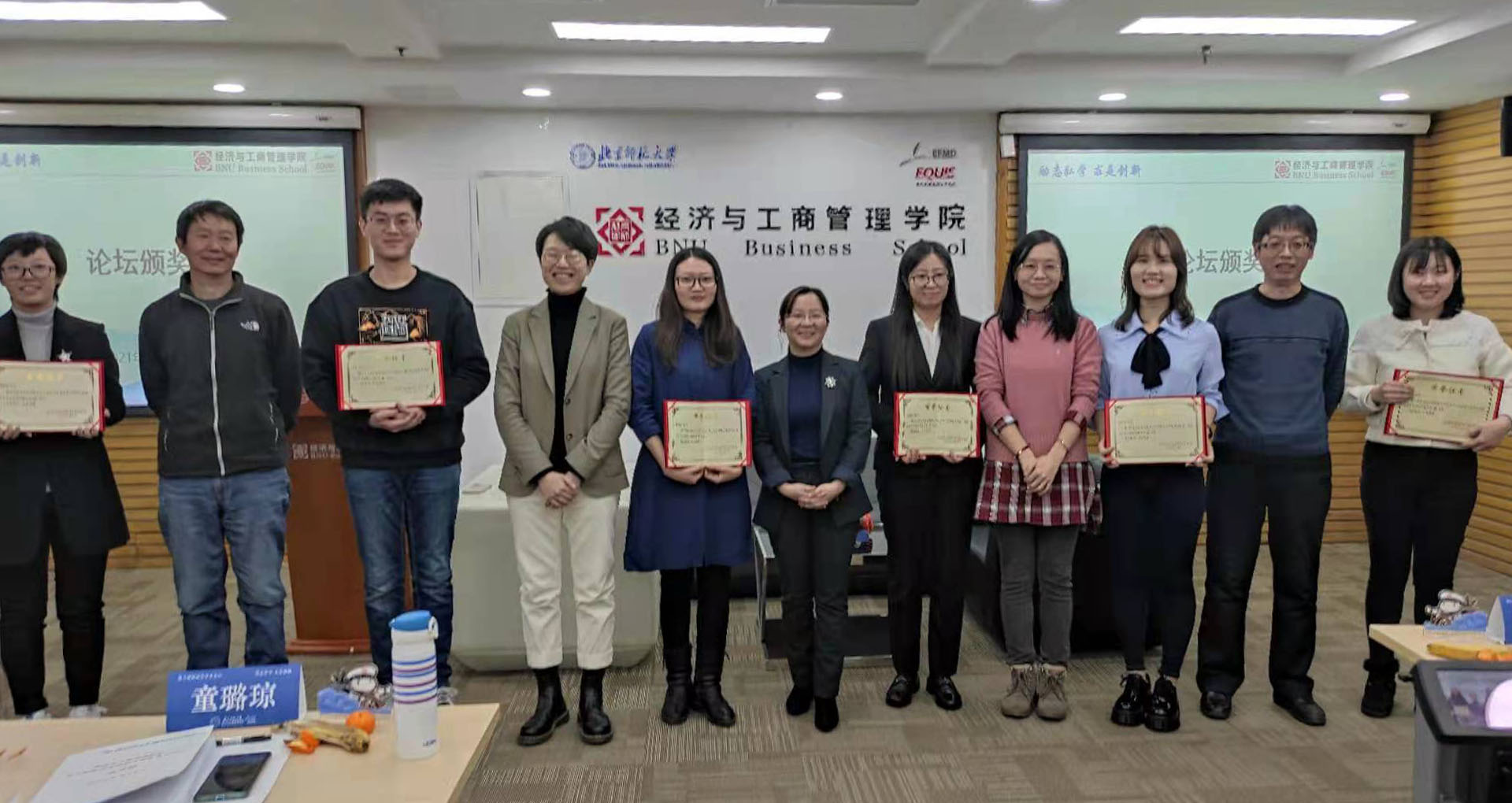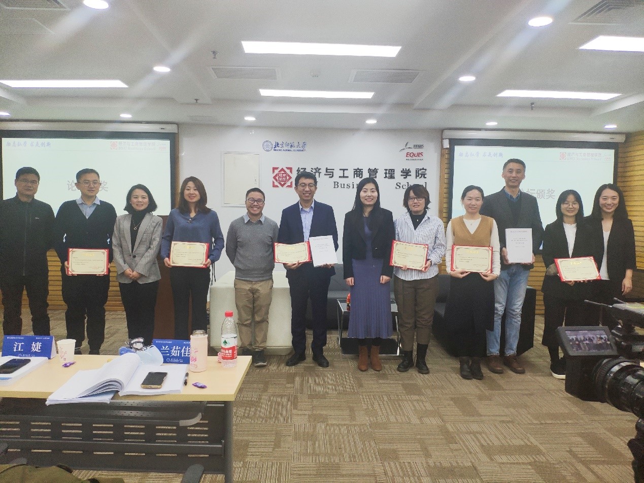 最后,由经管学院分党委副书记葛玉良老师为汇报的6名同学颁发优等奖证书和前七届见刊论文集(2013-2020年)。同时隔屏祝张惠琳和蔺鹏的论文被评为优秀论文。