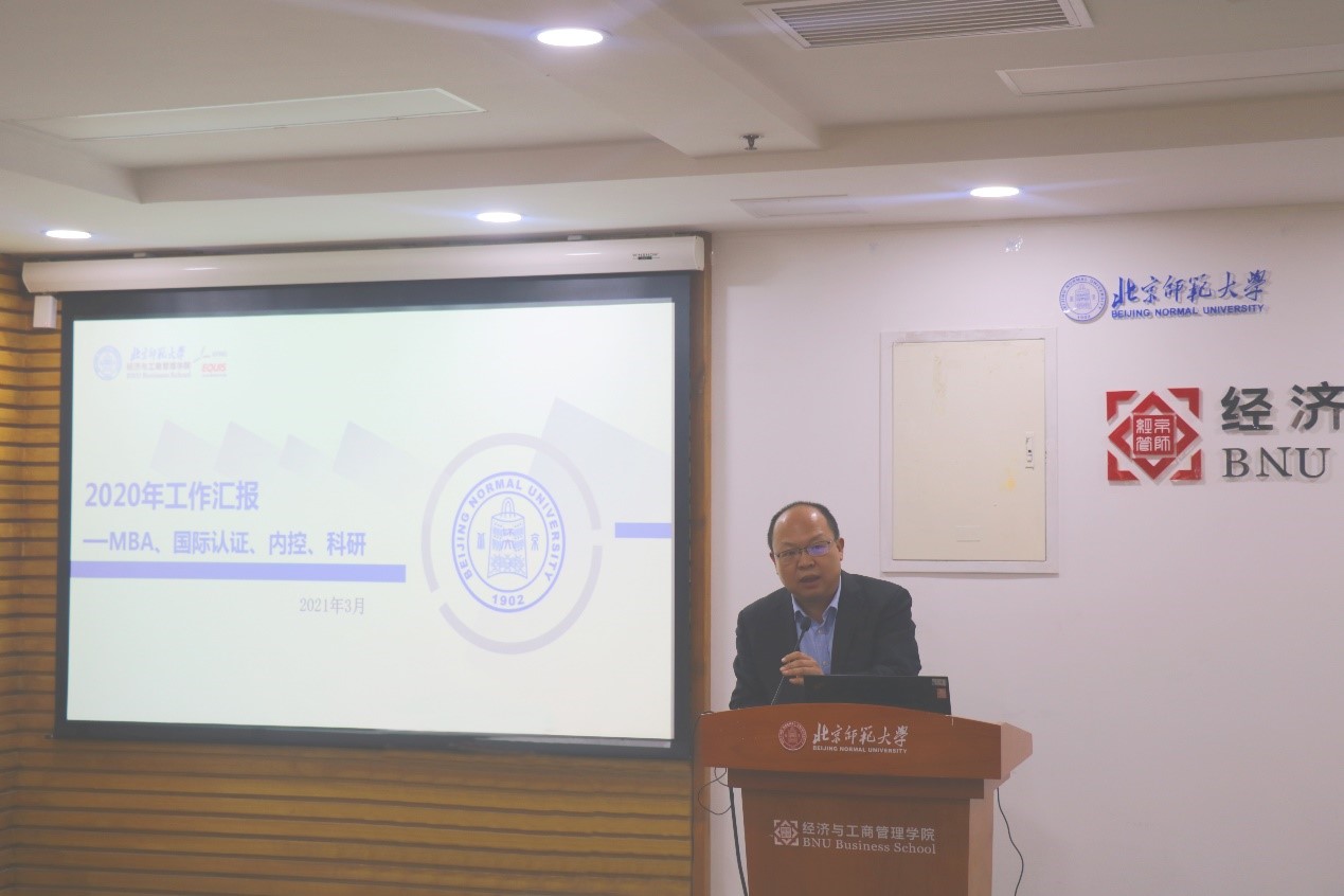 崔学刚副院长汇报了MBA教育、国际认证、内控等工作。MBA教育方面,2020年招生与品牌工作成果显著,受到多方认可;课程教学、讲座研讨、学位管理、学生管理、职业发展工作均有序开展;开展了校外导师聘任工作,学生满意度大幅提高。2021年计划招生400人,完成网络远程提前面试10个批次,落实“四个中心”定位,继续提升教育质量,提升品牌影响力。国际化认证工作方面,完成2020年度EQUIS进展报告,三个待改进领域首次全部顺利通过EFMD评估,以MBA教育为试点开始AOL制定探索,按时完成了AACSB“前期准备工作”。内控工作方面,整合了学院的内控框架,提前做好内控自查工作并进行了自查整改。