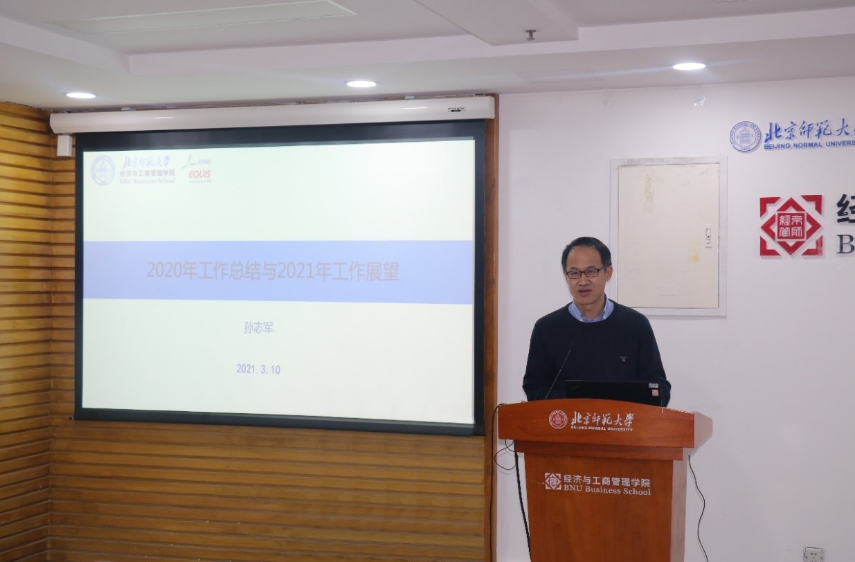孙志军书记就学院党委工作进行了总结与部署。2020年,学院党委坚持学用结合,将党的领导贯穿办学治院、教书育人全过程,推进课程思政建设,抓好“三全育人”工作;贯彻落实疫情防控各项工作,将党建工作与中心工作相结合,推动学院各项事业改革发展;以年度基层党建工作重点任务为主线,推动基层党支部规范化标准化建设,落实党管人才工作;坚持党对意识形态工作的领导权,深化落实全面从严治党主体责任;以学校党委巡察经管学院反馈意见会为契机,制定和落实巡察整改方案,切实解决相关问题;在疫情防控的总体要求下适时开展工会与离退休工作;按照财务规范管理制度,完成财务预算与支出管理工作。随后,孙志军书记通报了2020年学院财务收支决算等情况。最后,孙书记从个人履职、学院成就与挑战等方面总结了过去一年的工作,强调2021年将把握党史学习教育活动、建党100周年系列庆祝活动、十四五规划、疫情防控常态化等重要事件点,继续做好常规工作,改革创新基层党建、思政教育、师德师风建设、意识形态与党风廉政建设、人才培养工作机制建设、人才培育与引进的党管人才工作、财务、工会与离退休工作、巡察整改工作等。