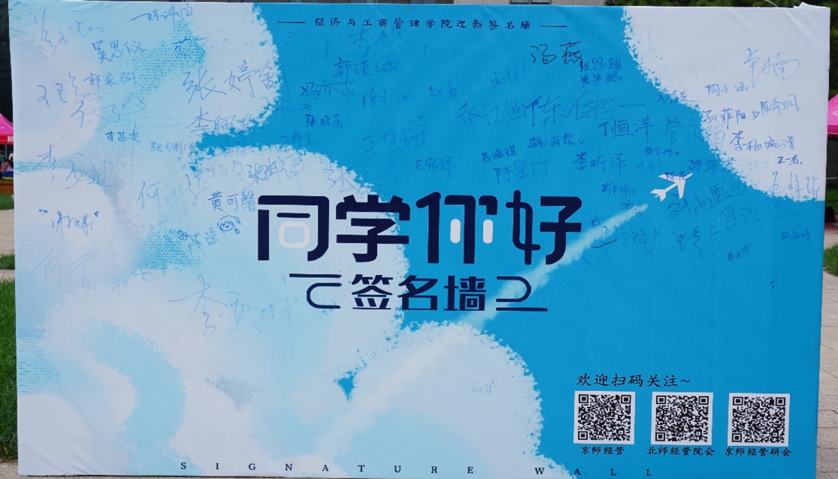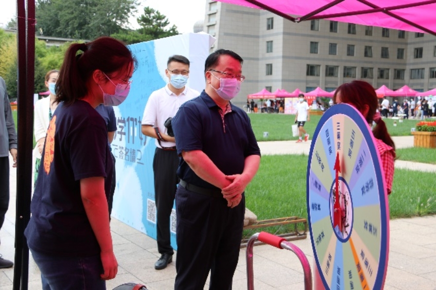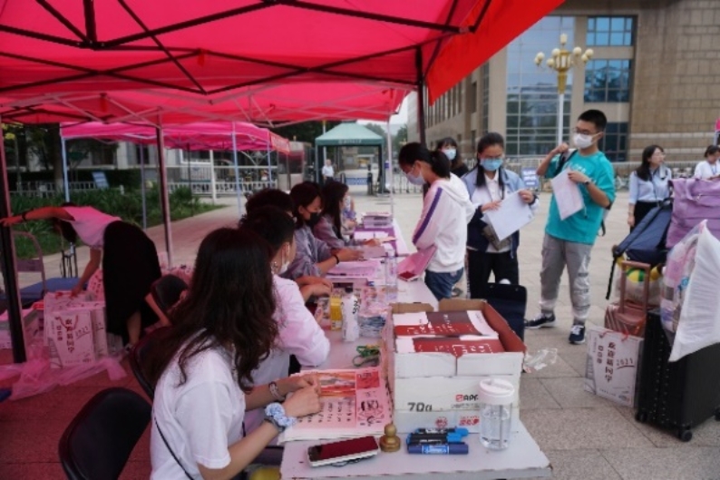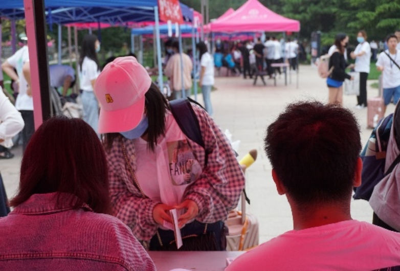 因校园防疫要求,家长无法陪同新生们进入校园,所以同学们在志愿者的引导下独自办理新生入学手续。迎新点依次为签到注册、材料分发等步骤,并且为各位新生准备了抽奖活动和签名拍照留念。迎新活动在工作人员及志愿者的引导下,有条不紊地进展着。