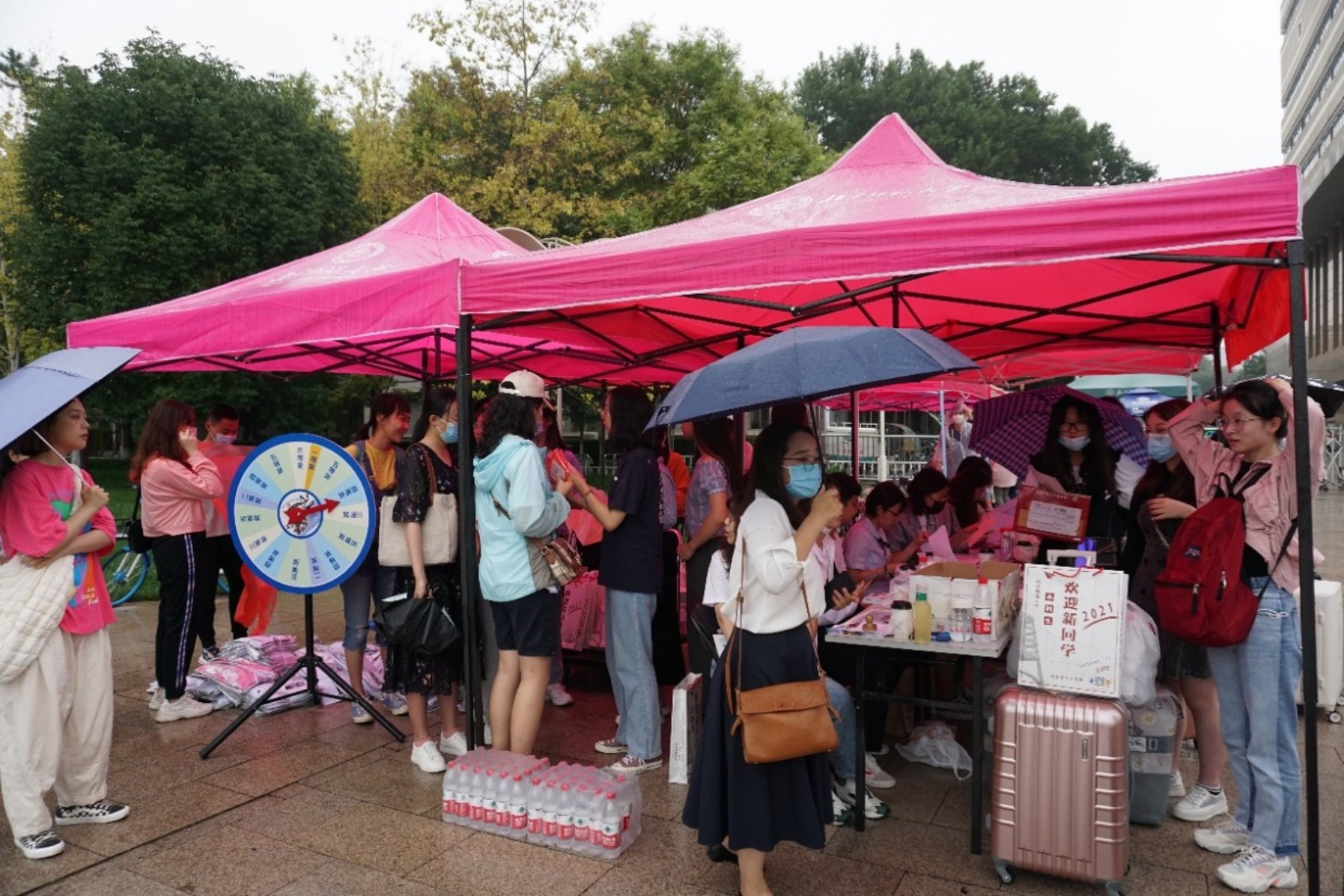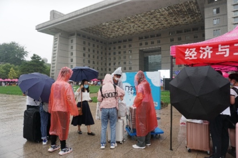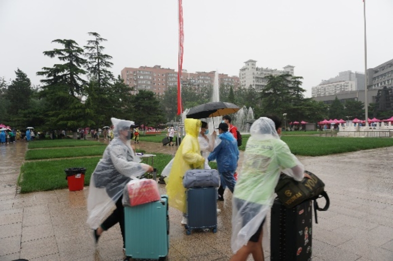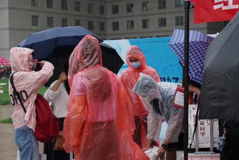 雨水并不能阻挡迎新工作。志愿者们披上雨衣,将新生送至宿舍楼办理入住。