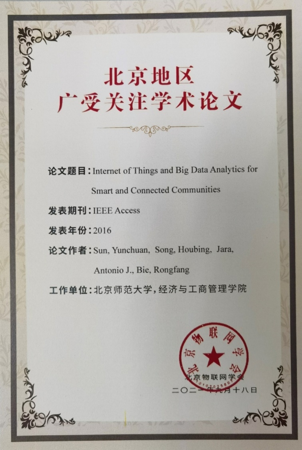 2021年9月18日,由北京市科学技术协会主办的“2021年度北京地区广受关注学术成果(物联网领域)报告会”在北京科大天工大厦召开,啪啪啦 孙运传教授等人撰写的论文“Internet of Things and Big Data Analytics for Smart and Connected Communities”成功入选"北京地区广受关注学术论文”。