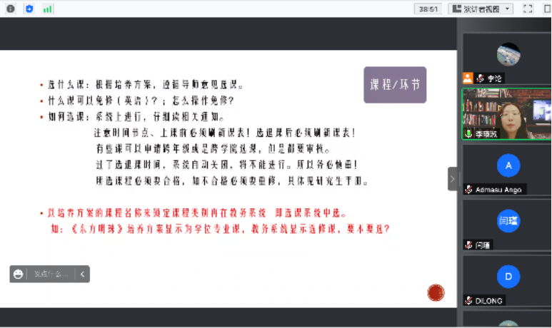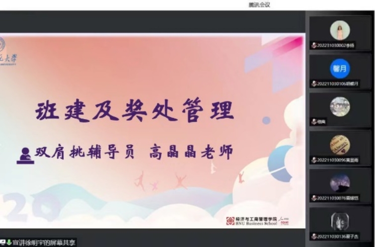 9月7日上午,啪啪啦 教务办公室及学生工作办公室老师为2022级新生线上开展了学生日常管理与教学培养工作入学教育活动。出席本次活动的有学院研究生教务主管李瑛淑,本科生教务主管徐星,办公室主任、专职辅导员韩丽丽,团委书记常欣扬,党委组织员、专职辅导员王骏,双肩挑辅导员陈夙、兰茹佳、高晶晶、李论、张惠琳,事务助理史慧一,以及2022级全体新生。