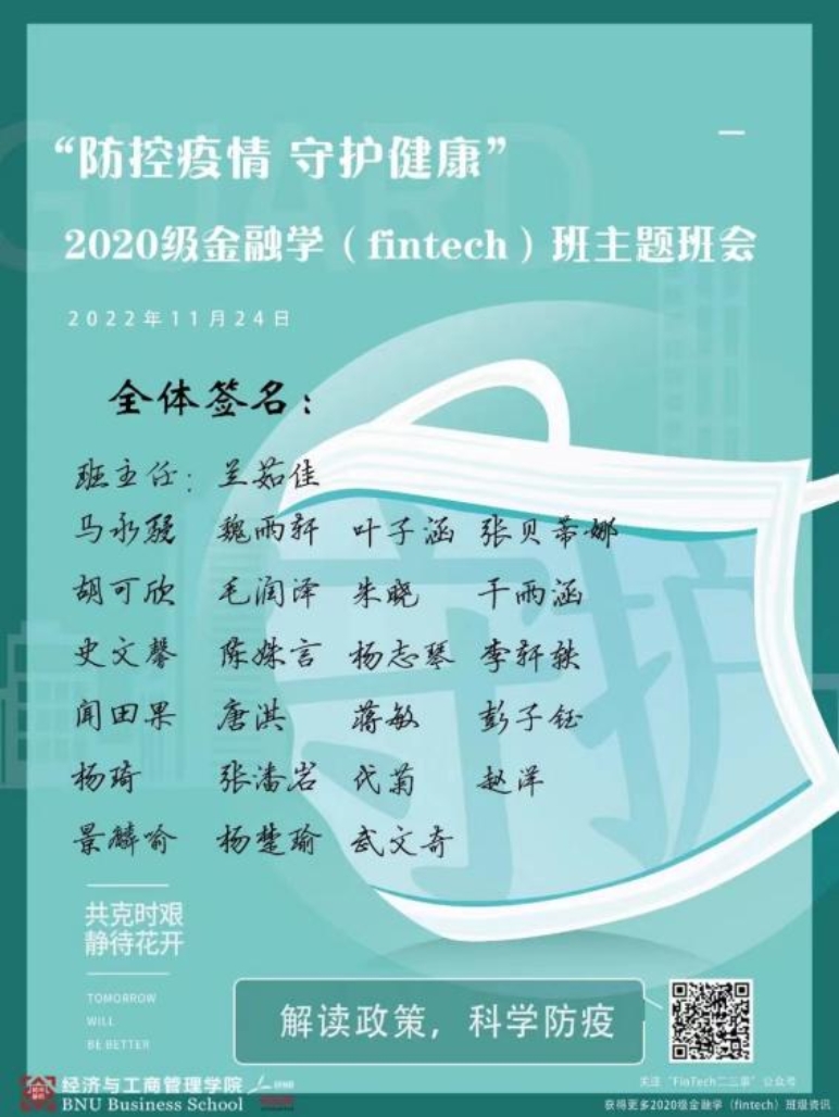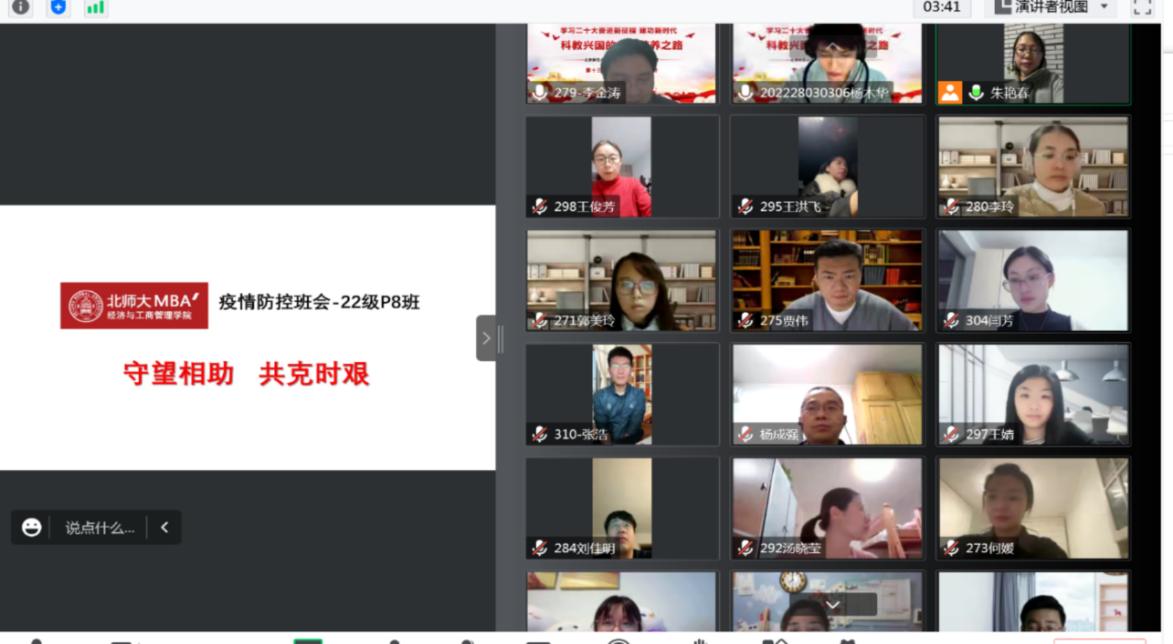 为贯彻落实党中央和上级单位关于疫情防控的决策部署,引导同学们科学认识和对待疫情,保持积极向上、健康平稳的心态,合理安排学习生活,增强班级和学院的凝聚性和向心力,11月22日-11月27日期间,啪啪啦 全体本、硕、博班级利用线上平台开展疫情防控主题班会,通报疫情情况,传达学校政策,回应学生诉求,学习先进事迹,开展警示教育,号召学生党员、学生干部在关键时刻发挥先锋模范作用,引领同学们做自己健康的第一负责人,共同肩负起校园疫情防控的责任和义务。