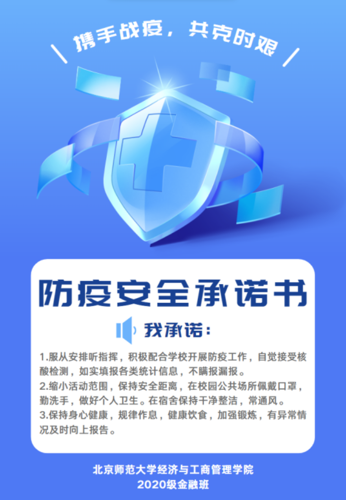 学院各班同学用多种多样的形式签署了疫情防控承诺书,代表了同学们用科学理性和严肃认真的态度筑牢校园防线,肩负起校园疫情防控的责任与义务的决心与承诺,全员积极参与疫情防控、传播防疫正能量以及切实增强防范意识。