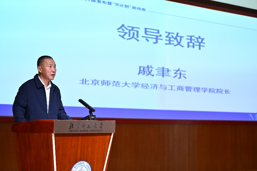 学院院长戚聿东教授在开幕致辞中,他全面介绍了北师大经管学院MBA培养体系的升级背景与使命,强调学院始终以“经邦济世、励商弘文”为使命,致力于培养兼具人文底蕴与社会责任感的管理人才;面对数智化浪潮,MBA项目以“DUTY”为内核,构建了“理论+技术+场景”三位一体的培养模式,并致力于培育具有跨界融合能力的复合型管理者,让每一位学子成为推动产业变革的“创新领袖”;同时,他阐述了学院“基于商业场景的校企共育商科人才模式”,并提出校企共育的三大行动路径:双导师制深化产教融合、场景化教学重构能力培养和终身学习生态构建。最后,戚聿东教授深情展望了学院未来主动引领人才培养和产业变革的发展方向,鼓励大家携手共同打造孕育未来商业领袖的沃土。