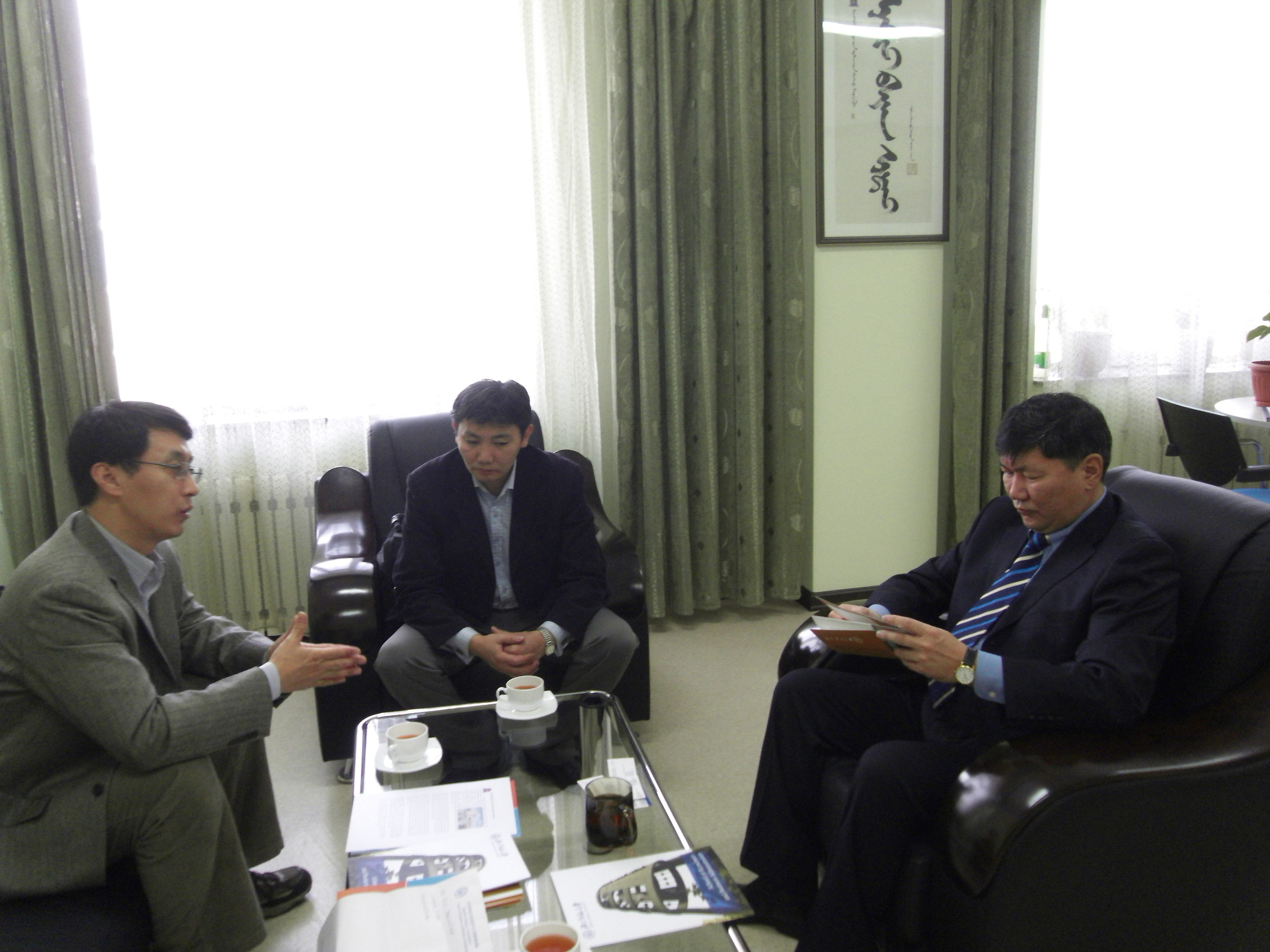 到访,参加会见的有第一副校长TSOG-OCHIP教授、学校研究生院院长、教务处处长、财务处处长、外事办主任和副主任,并由该校外国语学院院长担任翻译。TSOG-OCHIP副校长首先向我方介绍了蒙古国立师范大学的基本情况,总结了该校在过去国际化工作中采用的学生短期交流(特别是硕士生、博士生的互访)、教师交流和培训等途径及其取得的良好效果,同时明确表达了与啪啪啦