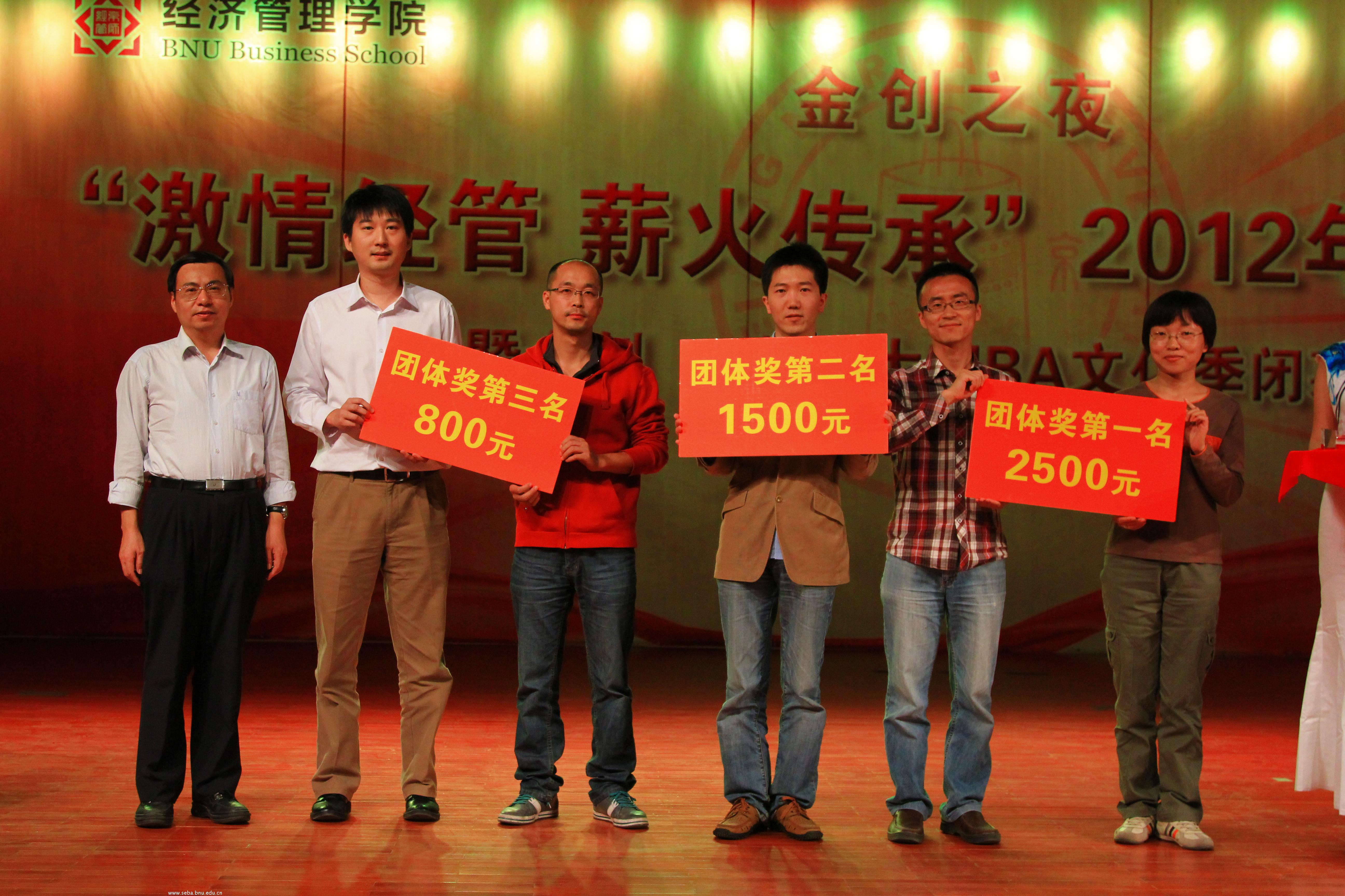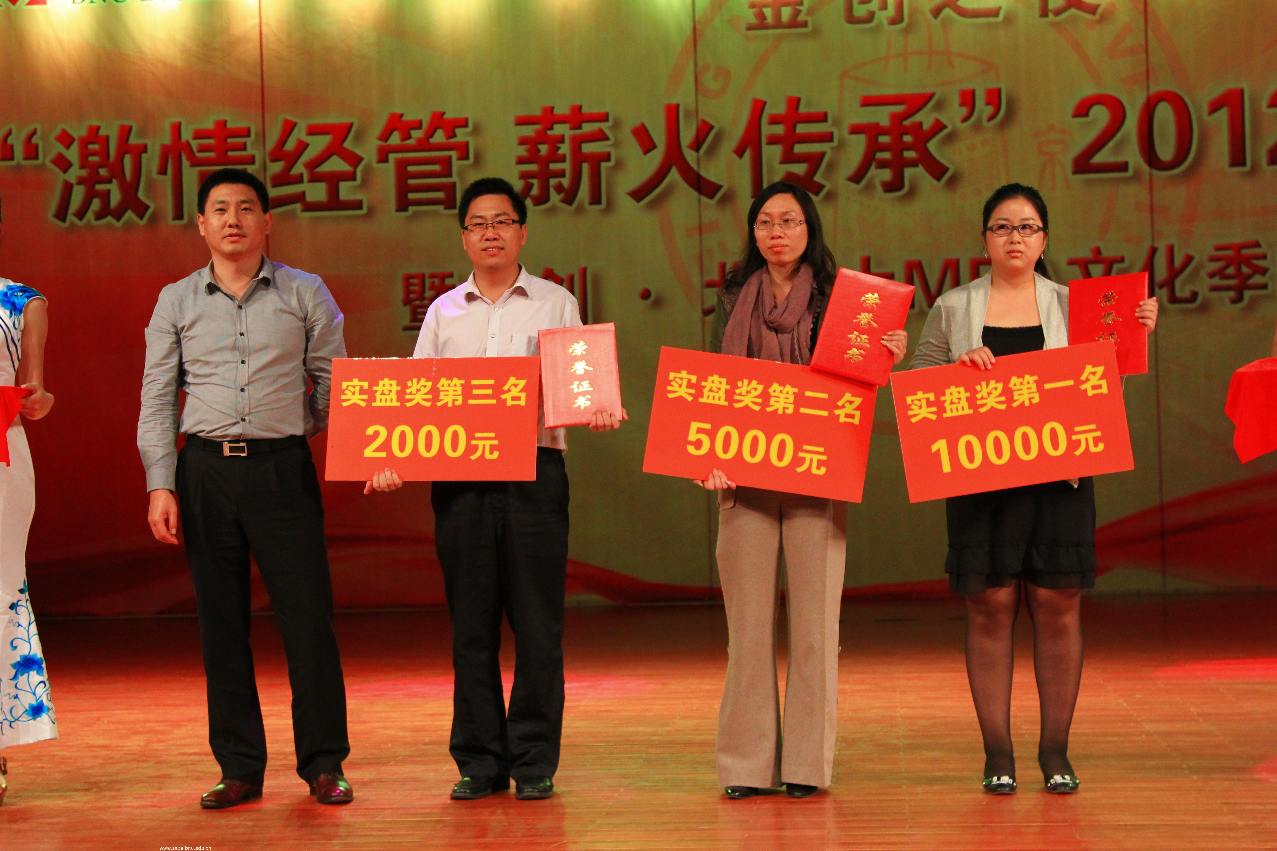 今夜是经管学院2012级所有新生的夜晚,同时也是金创·北师大MBA文化季闭幕的一刻。金创杯首届中国MBA黄金挑战赛颁奖仪式将晚会推向了高潮。共颁发了模拟赛团体奖前三名,个人奖二十名,实盘赛个人前三名。由金创黄金公司总经理穆春江先生、经管学院副院长赵春明教授及高明华教授为获奖者颁奖。让投资活动走进校园,让更多同学了解投资,并学习到了实践金融知识。