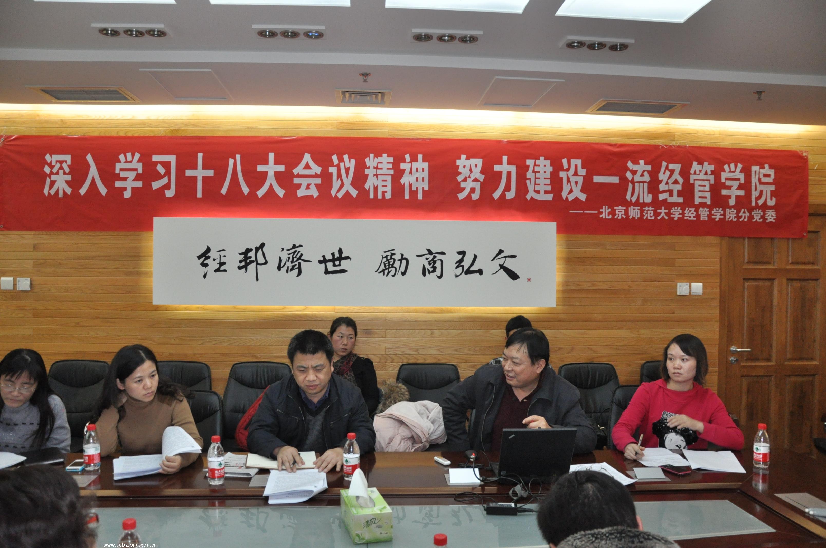 最后,赖德胜院长在总结中谈到,当前学习贯彻党的十八大会议精神是全党、全军、全国各族人民的第一政治任务。十八大报告内容丰富,是中国最新版的政治经济学,值得经管学院每一位老师和学生学习。关于科学发展观,赖老师认为,科学发展观是第一要义是推动经济社会发展,核心是以人为本,基本要求是全面协调可持续,根本方法是统筹兼顾,这也是指导我们做人做事的基本原则。关于如何落实科学发展观,促进学院发展,赖老师提出了自己的设想:第一,发展是学院第一要务,学院也要扩大资源供给的边界,使收入翻番;第二,进一步提高办学质量,使人才培养、科学研究、服务社会等方面的质量均取得突出的进步;第三,进一步提高学院的影响力,在学术影响力、决策影响力、社会影响力和国际影响力等各个方面都得到提升;第四,继续改革创新,要逐渐从院办系转变到系办院的管理模式,发挥系、学科组、团队和每一位师生的作用,释放学院的活力;第五,正如习近平总书记说说,人民对美好生活的向往,是我们的目标。我们要给老师和学生提供更好的福利待遇,更好的发展空间。