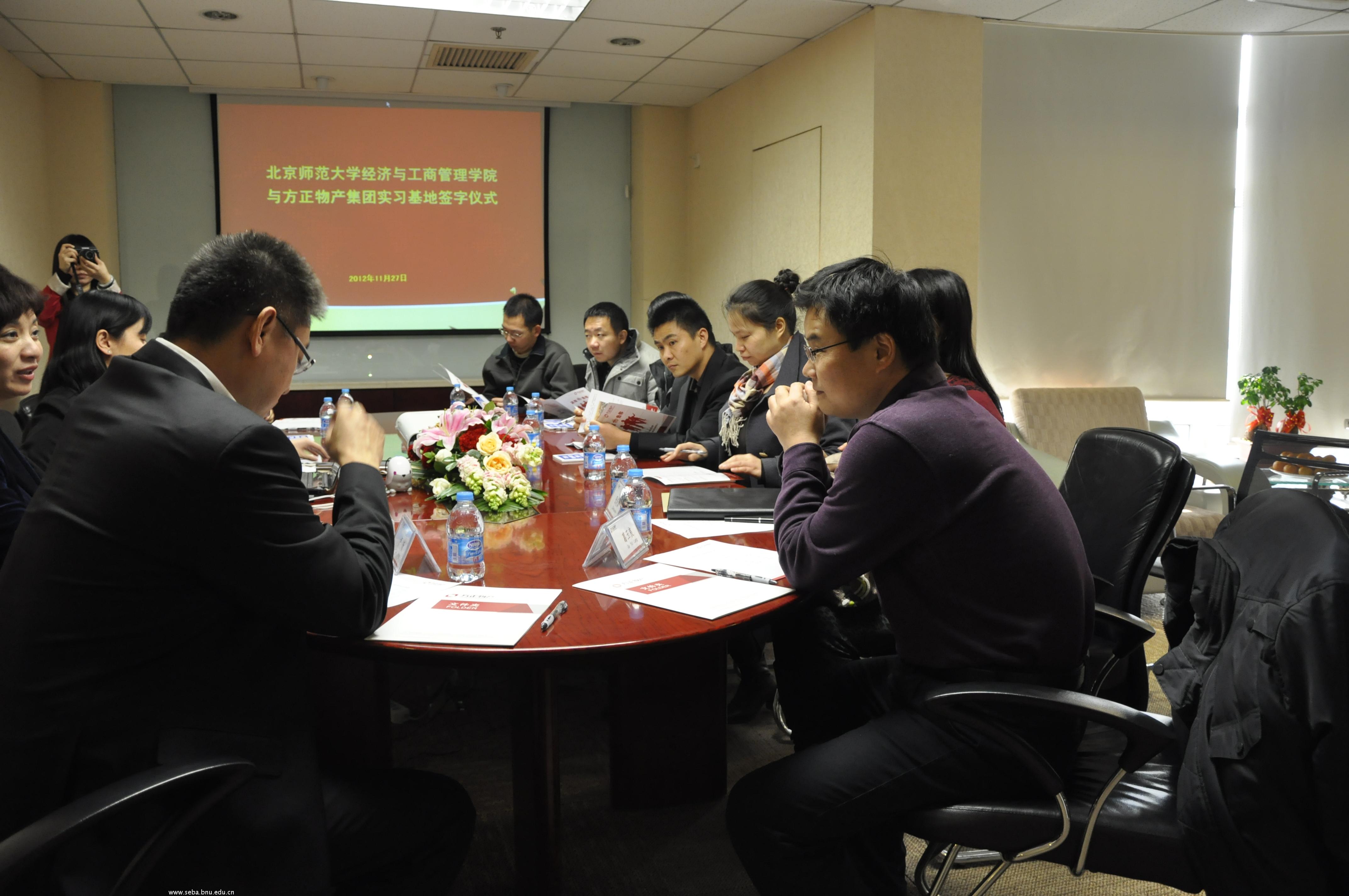 以及经济管理学院的历史、师资状况、学科设置等。葛老师认为经管学院的学科设置与北大方正物产集团的人才需求有很大的契合度,这种契合非常有利于今后的合作。葛老师希望一方面师大经管学院的学生能走进方正物产集团实习或就业,另一方面也希望方正物产集团的管理层走进北师大经管学院,让学生提前感受企业的文化和用人理念。