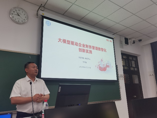 2024年6月25日上午,首先由用友智能财务解决方案总监、用友高级项目咨询专家吕华新做了“AI赋能财务管理转型,助力企业高质量发展”专题讲座,深入浅出地讲解了“AI+财务”转型背景和挑战、企业财务数智化转型路径和方法,同时,还通过生动的案例和应用实践展示了“AI+财务”应用场景,使同学们对这一领域有了更加清晰的认识。其次由新道科技股份有限公司校企合作高级咨询顾问、高级教育规划顾问梅军刚做了“大模型驱动企业财务管理数智化创新实践”专题讲座,清晰地解读了生成式人工智能(AIGC)、大模型与Prompt提示工程,展示了大模型在财务主题中的应用,激发了同学们对新技术的好奇心和探索欲。