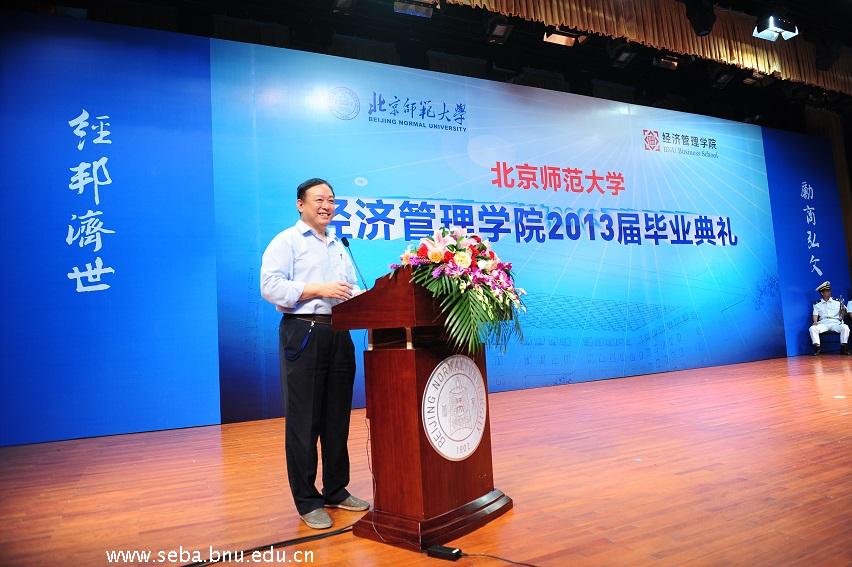 经济管理学院2013届毕业典礼拉开帷幕。典礼首先由经管学院院长赖德胜教授致辞,赖院长向所有毕业生献上了最热烈祝贺和最真诚的祝福,并同各位同学一同回忆、分享了北师大校园生活的点滴。在即将毕业的时刻,赖院长叮嘱毕业生要有自己的梦想,无论梦想是齐家治国、成为祖国的栋梁,还是结婚生子、经营温馨的小家,有了梦想,才有努力的方向。为梦想而奋斗,是骄傲且幸福的。经管学院愿做同学们追梦、圆梦的见证者,也愿做寻梦途中的坚实后盾,更会是永远的温暖的家。