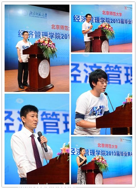 而后,由毕业生代表发言。先是本科生代表高任飞同学发言,从见证师大四年的变化中,表达了深刻的感慨和感谢,感谢母校、学院领导和老师、父母及家人,最终以一首《虞美人·毕业》与各位同学共勉。然后由硕士研究生代表张吉良同学发言,在回过头来看研究生涯的时候,收获了相当的财富;展望未来,无限憧憬,并将铭记“京师经管”四个永恒的字眼。MBA学生代表赵可石接下来发言,在自己解读了经管院训“经邦济世,励商弘文”的基础之上,来反思自己曾经的师大生涯、憧憬即将踏入的新的征程,在广阔的天地中去施展丰富学识、聪明才智和远大抱负。留学生代表柳善烈同学发言,从入学时不同文化的融入、中国留学梦的实现、积极参与的各项活动展现了在师大的生活。最后,由学生家属代表上台发言,作为北师大的半个学生,表达了对学校、学院的感谢之情。