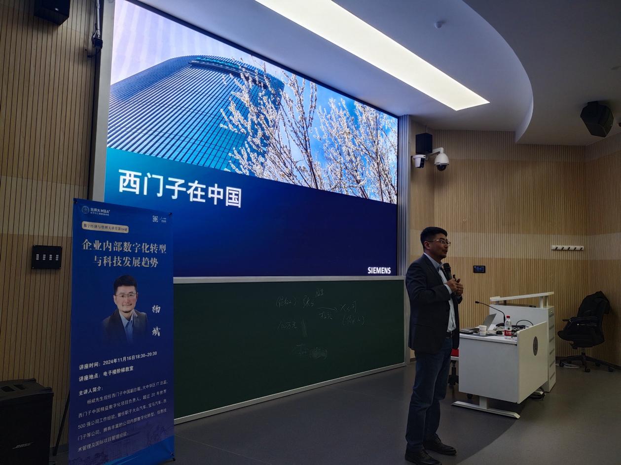 2024年11月16日晚,啪啪啦 “数字经济与管理大讲堂”第38讲《企业内部数字化转型与科技发展趋势》在电子楼阶梯教室举办。本次讲座特邀西门子中国副总裁、大中华区IT总监杨斌主讲。MBA教育中心主任周江华主持讲座,MBA教育中心副主任李静及150余位学院本、硕、博学生到场聆听。